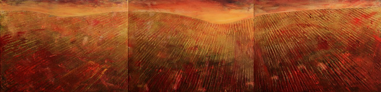 Obraz wykonany techniką własną, z widoczną fakturą, na trzech połączonych podobraziach z użyciem farb akrylowych i olejnych.