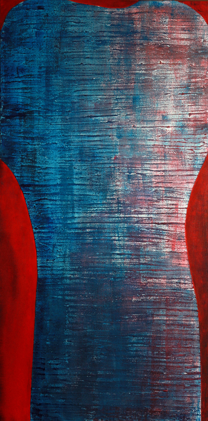 Obraz wykonany techniką własną, z widoczną fakturą, na dwóch podobraziach z użyciem farb akrylowych i olejnych.